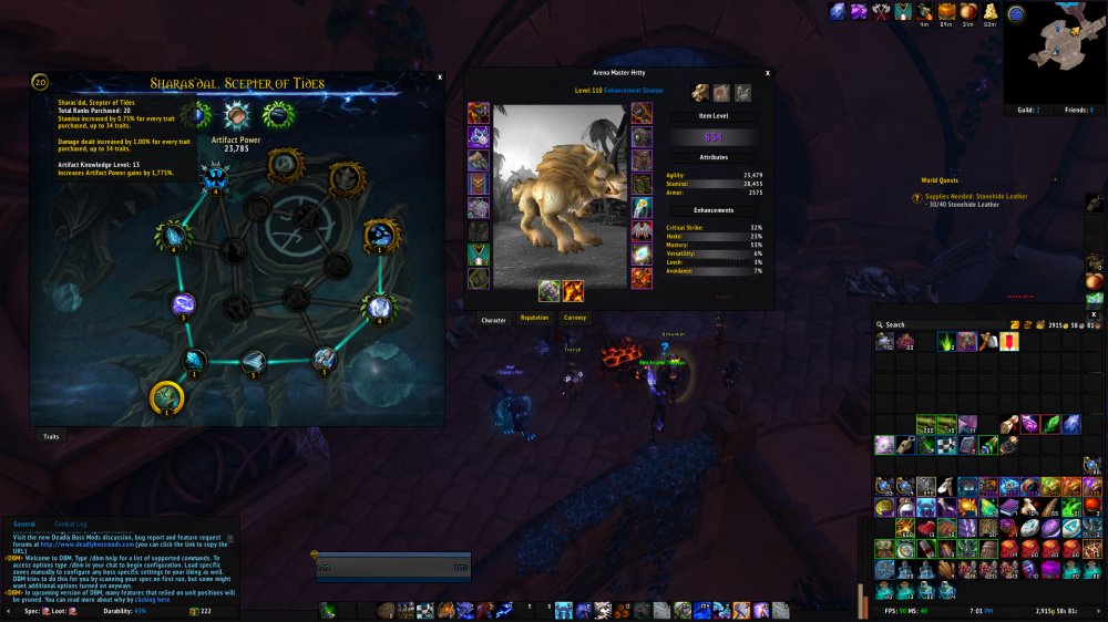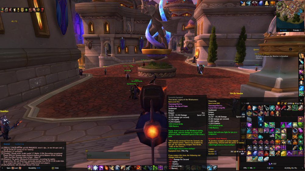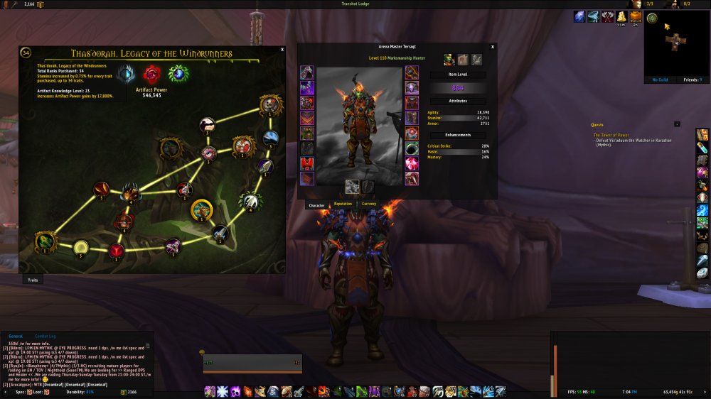 885 HUNTER = 20645 Achievs = Arena Master = Battlemaster = Champion 2000 Rating RBG = 2200 in 2s| 3S | 5s = 51 Feats of strength: Swift Razzashi Raptor | Camel Hoarder | Soldier of the horde | Time Lost Proto Drake | X-51 Nether Rocket | Fiery Warhorse | Onyxian Drake | challenger Yeti = 911 artifact - 34 Traits - 23 AK Lvl = 4/7 EN Mythic | 2/3 ToV HC = 110 Shaman Old Main = 6 x 100 Alts = 429 Eur