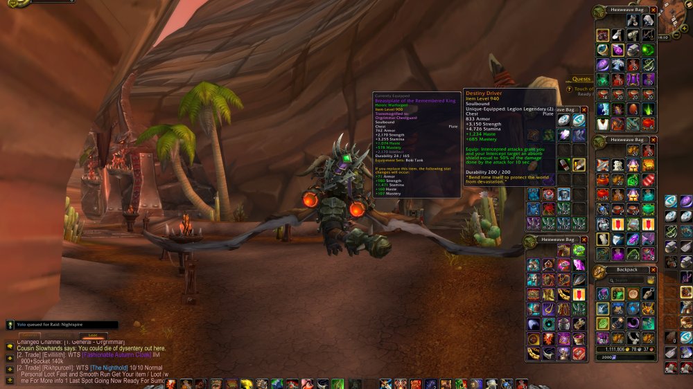 921 Protection WARRIOR = 44th Rank Gearwise on the world = 911 ilvl Equipped = 5/10 Mythic NH = 5 Legendaries, two BIS: Aggramar's Stride | Sephus'z Secret | Destiny Driver | Kakushan's stormscale Gauntlets | Mannoroth's Bloodletting Manacles = 25 AK Research, 54 traits Protection, 48 Arms = TUSK OF Mannoroth Shoulders, Rarest item as drop rate 0,001% = 699 Eur