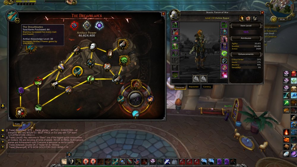905 Outlaw ROGUE = 12660 Achievs = 10/10 HC NH = 44 Traits - 30 AK Research lvl = 6 Legendaries: Will of Valeera | Insignia of Ravenholdt | Shivarran Symetry | cinidaria, the Symbiote | Prydaz, | Sephuz's Secret = 880 WW Monk alt = 300K Golds = 299 Eur