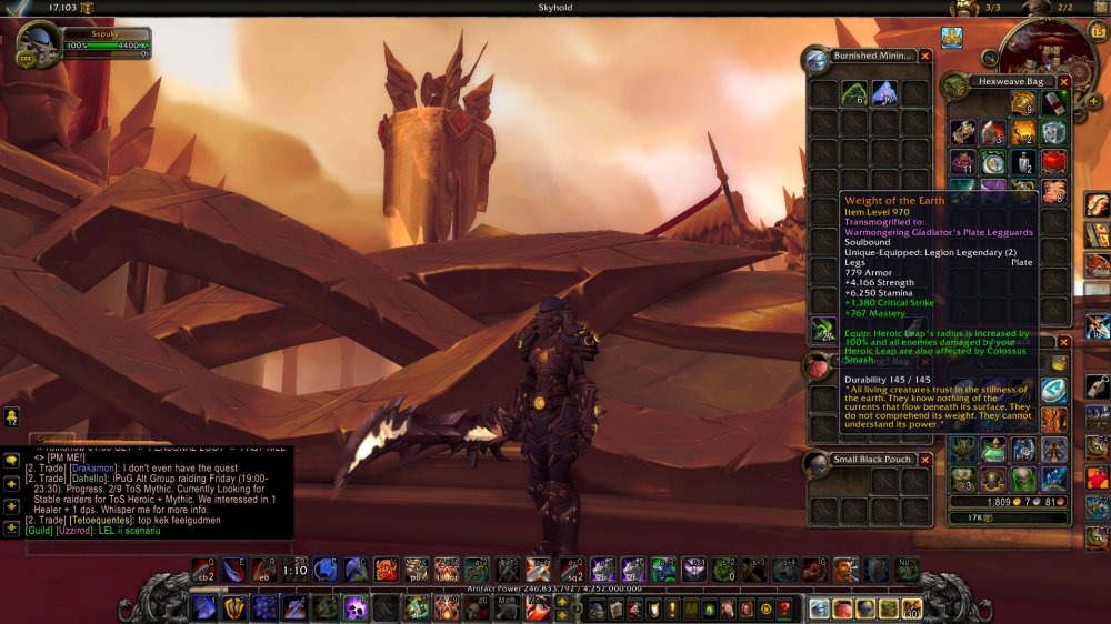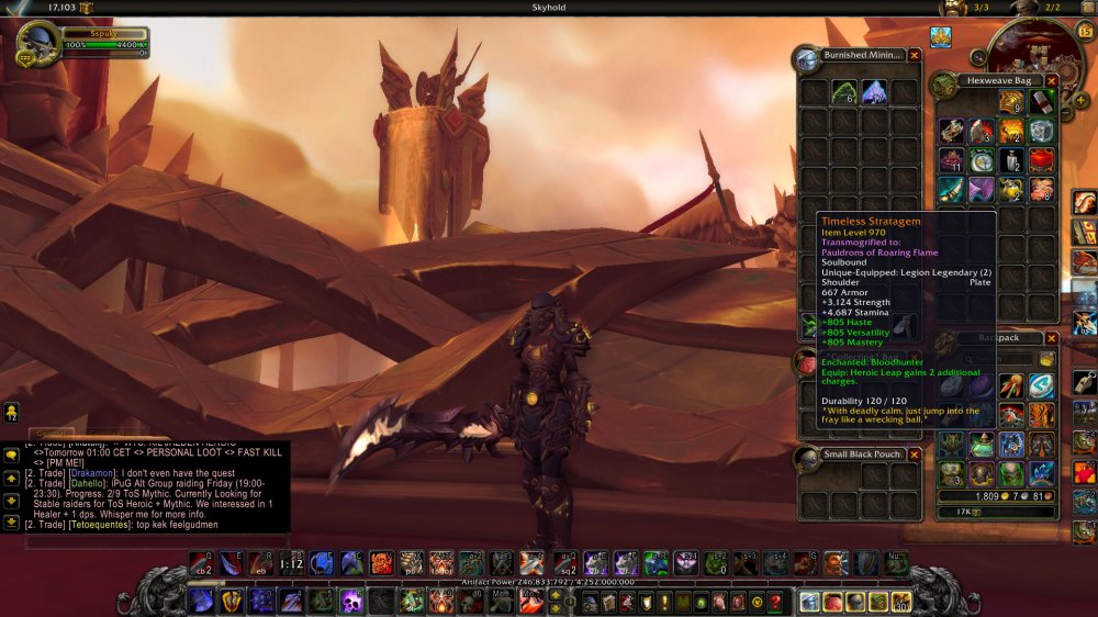 926 Arms WARRIOR = 8/9 HC ToS = 60 Traits Arms / 39 Fury / 35 Prot - 42 AK= Legs in bags: Mannoroth's Bloodletting Manacles / Weight of the Earth / Prydaz /Timeless Stratagem in bags = Character Sale only = 289 Eur