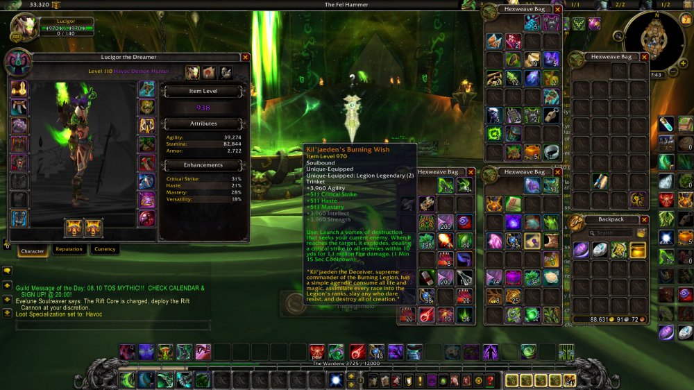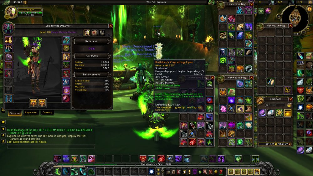 946 Havoc DH = 2175 Achievs = 9/9 HC ToS = 70 Traits Havoc / 64 Vengeance =1000 Legs in bags: Mo'arg bionic Stabilizers/ The sentinel's eternal refuge / Delusions of Grandeur = 970 Legs: Kil'jaeden Burning Wish / Raddon's Cascading Eyes = 129 Eur